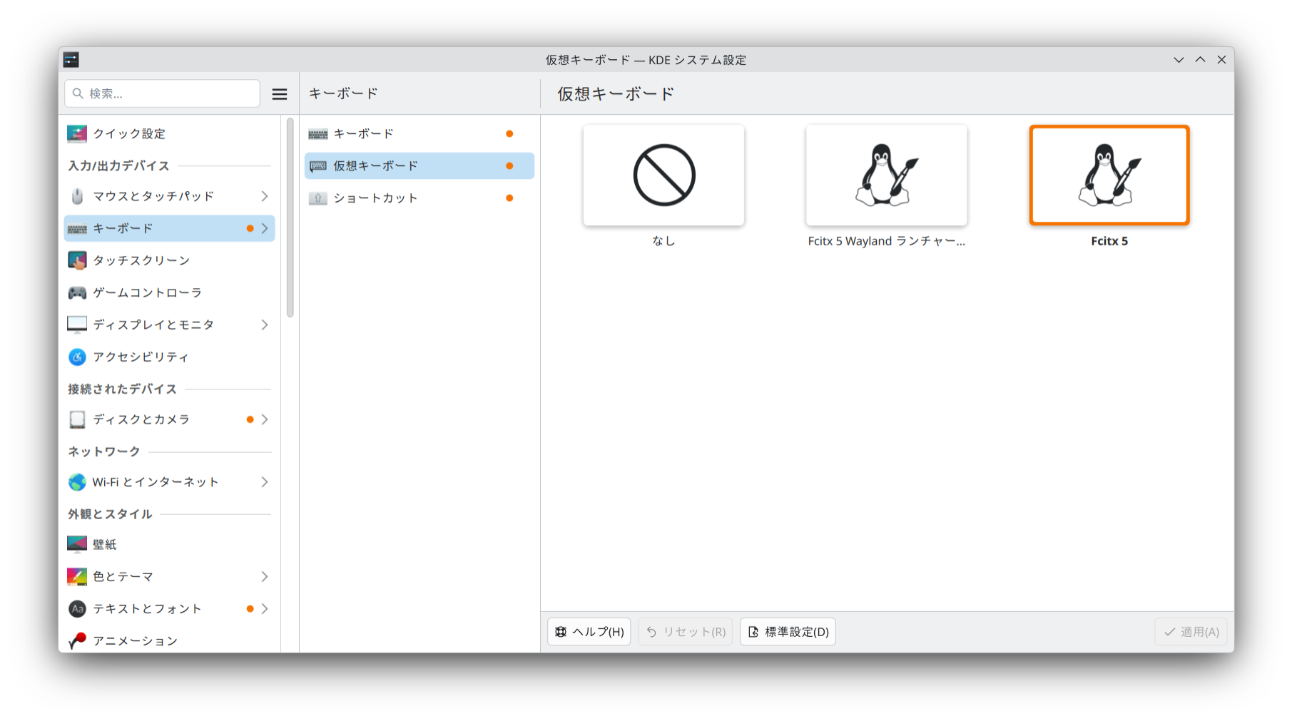 KDE の システム設定 → キーボード → 仮想キーボード で Fcitx 5 を選びます。