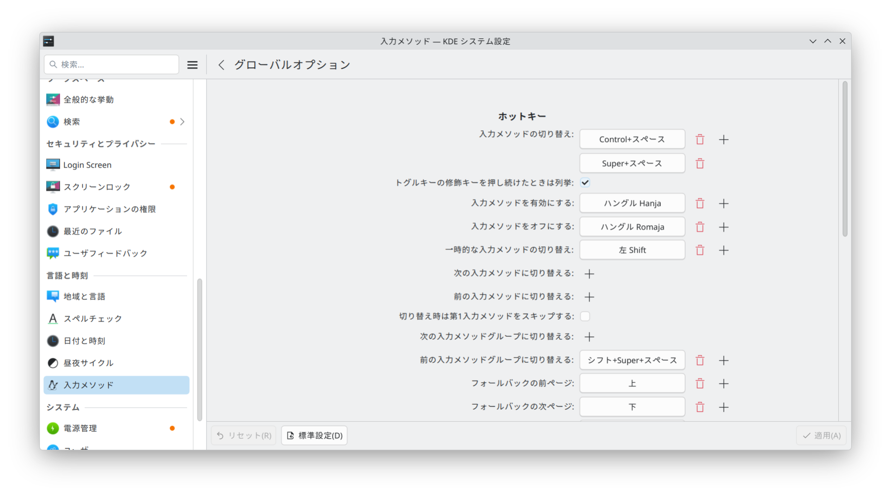 切り替えのホットキーは 入力メソッド → グローバルオプションを設定