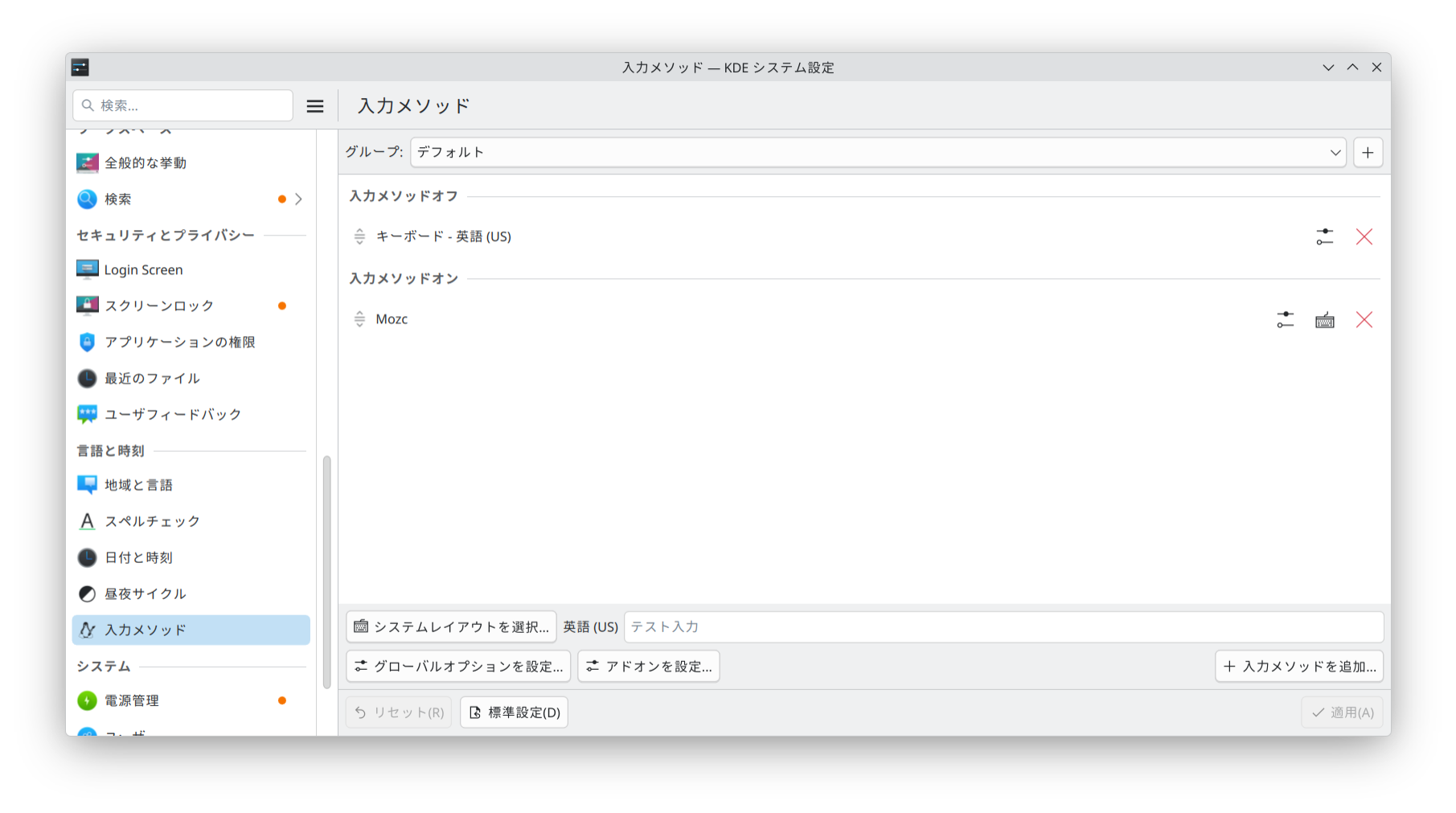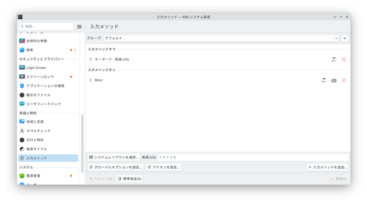 入力メソッド 設定画面を開き、入力メソッドに Mozc を追加します。