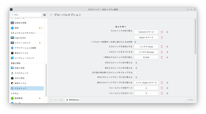 切り替えキーは Ctrl+Space か Super+Space に設定していますが、お好みで設定してください。
